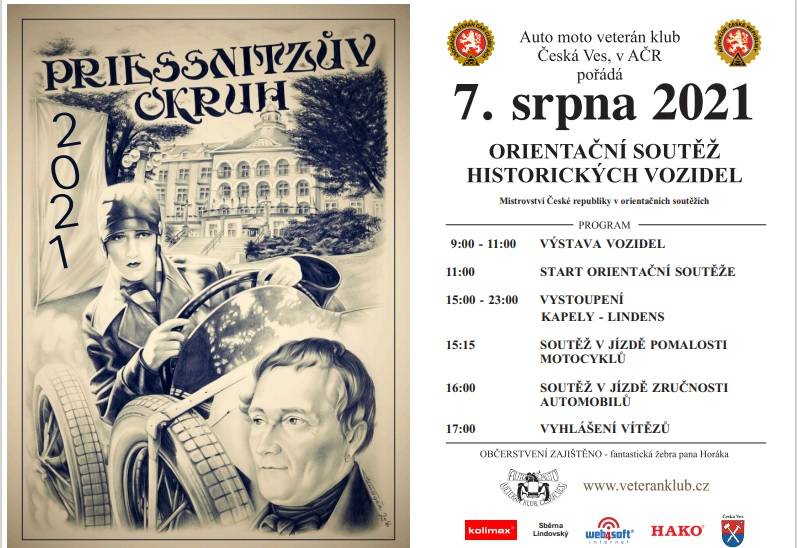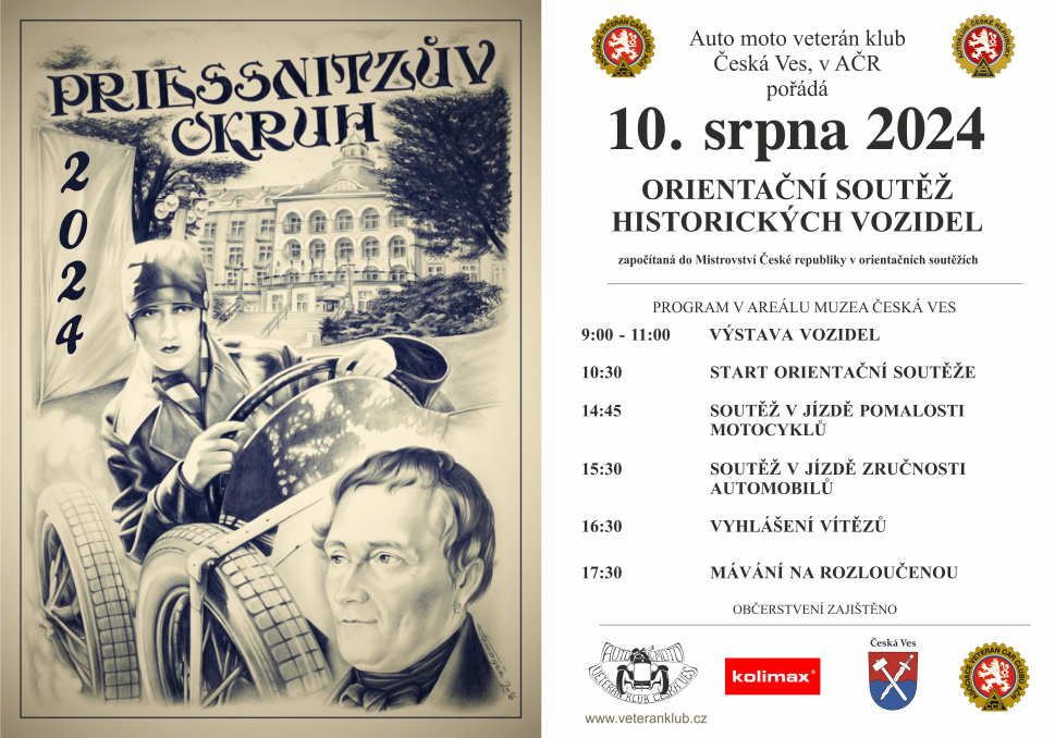Články | 28.08.2025 Zveme všechny přátele a majitele veteránů na naší jedinou letošní společnou akci připravenou se spřáteleným Polským veterán klubem na 7. září 2025 místo konání: Parkowa 4a, 48-340 Głuchołazy, Polsko | | | 04.08.2025 Zdravíme všechny přátele motorizmu a vereránů zvlášť. Tímto příspěvkem informujeme, že v roce 2025 rušíme tradiční soutěž veteránů v areálu muzea v České Vsi. Doufáme, že se nám v příštích letech podaří opět soutěž obnovit. Muzeum funguje dle otvírací doby a těšíme se, že aspoň shlédnete naše vystavené exponáty. Pro skalní příznivce přidávám letáček na akci v Polsku, která se koná 7.9.2025, náš veterán klub se jí bude účastnit a vypomáhat pořadatelům. | | | 24.09.2024 Přátelé motorizmu, tak nás také postihly letošní povodně. Česká Ves byla hodně poškozená, cesty podemleté i popadané domy. Takové množství vody se jesenickem neprohnalo ani v roce 1997. Muzeum naštěstí přečkalo povodeň celkem dobře a jsme rádi že můžeme v činnosti pokračovat. Přikládám několik snímků z areálu muzea. | | | 10.08.2024 V letošním roce tradiční soutěž auto a moto veteránů chystáme na 10.8.2024. Tímto jste všichni zváni. | | | 03.06.2024 Výlet se uskutečnil ve dnech 3.-9. června 2024 | | | 16.03.2024 Upozorňujeme na letošní retestace které se již rozběhly, kdo potřebuje kontaktujte pana Hanulíka. | | | 17.04.2023 Letošní Priessnitzův okruh 2023 se chystá na 12. srpna 2023. Všechny kdo by měli zájem se zůčastnit srdečně zveme. Potřebné informace najdete v propozicích. | | | 03.05.2022 Orientační soutěž historických vozidel se letos uskuteční 13.8.2022. Zveme všechny přátele vetránů ať účastníky nebo návštěvníky naší akce. Propozice a leták ke stažení ve formátu PDF níže.. | | | 15.07.2021 Orientační závod historických vozidel se letos uskuteční 7.8.2021 Přihláška, plakát a propozice jsou ke stažení po rozkliknutí níže na této stránce v souboru PDF. | | | 08.08.2020 Orientační soutěž historických vozidel 8. 8. 2020 | | 02.08.2020 Z důvodu narůstající druhé vlny epidemie, narůstajících a připravovaných plošných opatření, odvoláváme orientační soutěž historických vozidel. | | |